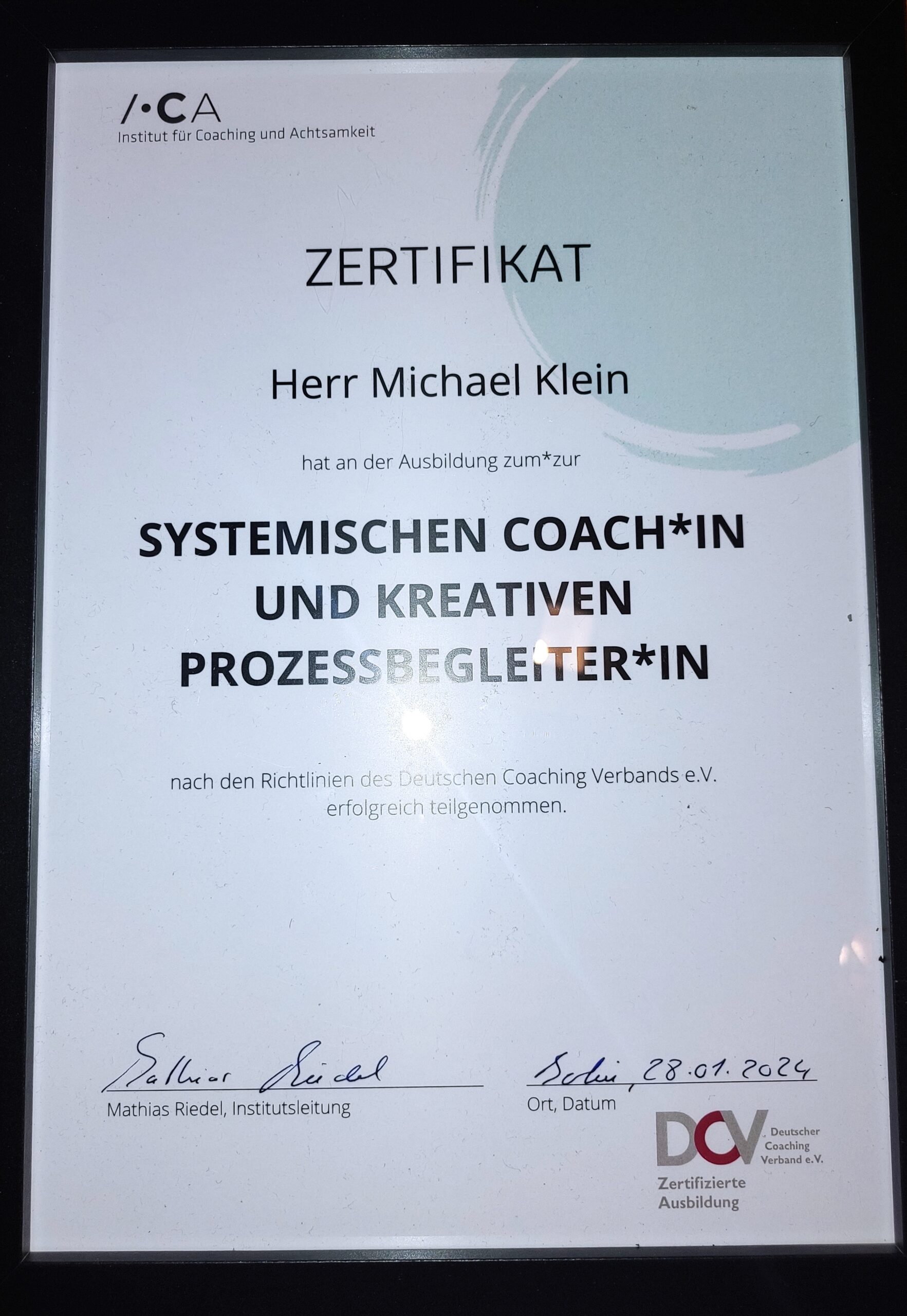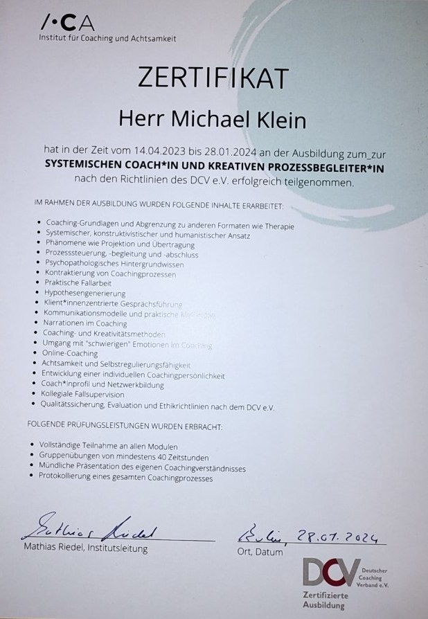 - Zertifizierter (DCV) Systemischer Coach mit Achtsamkeit, 2024 (Zertfiikat 1, Zertifikat 2)